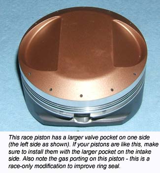that valve pocket needs to be positioned to the intake side. Likewise, if there is any kind of a clearance cut on the piston skirt, that side needs to be
