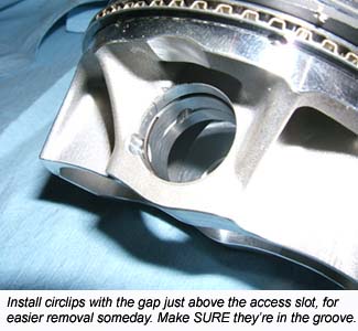 - When it comes time to remove the pistons, first place rags under the pistons to eliminate the possibility that your wrist pin circlips might fall into the crankcase.