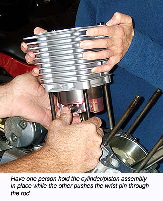 - Carefully place the cylinder and piston assembly over the cylinder studs and slide it down. Have one person hold the cylinder while the other person puts the top end of the connecting