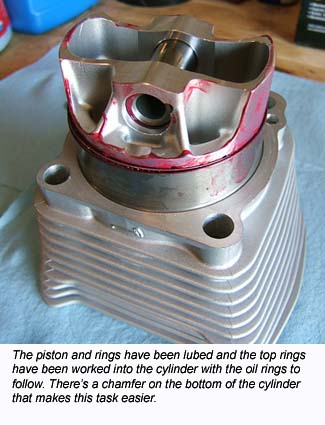 top of the cylinder. Put the piston into the cylinder upside down, and push the second ring down the bore. The piston will stop at it's oil ring. An inverted piston with oil rings installed like this