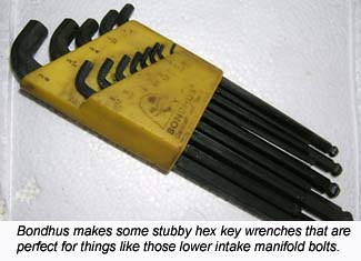 - A 5/16" L stubby type hex key wrench (Allen) will be needed to remove the lower manifold bolts. Many people cut down a standard L wrench. Bondhus makes a really nice set of stubby wrenches though.