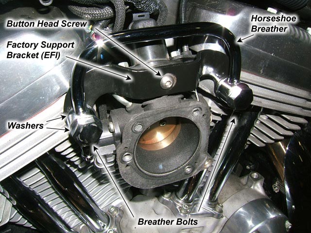 - During the process of removing the factory air cleaner, the factory breather bolts were removed. Install the new hollow breather bolts and